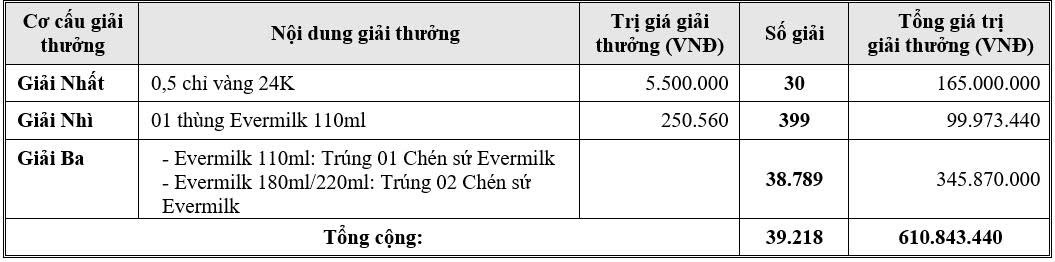 - Đối với Giải Ba: CHÚC MỪNG BẠN ĐÃ TRÚNG 01 CHÉN SỨ EVERMILK (thẻ vàng) hoặc CHÚC MỪNG BẠN ĐÃ TRÚNG 02 CHÉN SỨ EVERMILK (thẻ xanh).