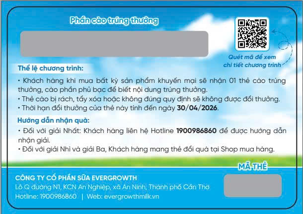 - Khách hàng mang thẻ cào trúng thưởng đến điểm bán sữa Evermilk để đổi thưởng; Điểm bán sữa Evermilk thực hiện đổi thưởng cho Khách hàng và thu hồi thẻ cào mà Khách hàng mang đến đổi.